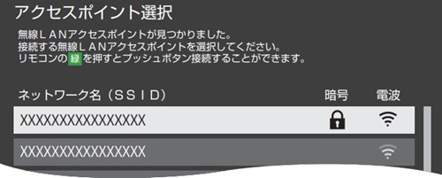 アクセスポイント(SSID)が1つも検出されない場合はテレビのリセット操作を行い改善するかご確認ください。