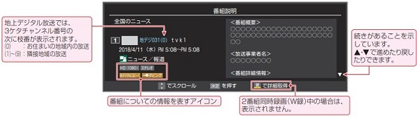・放送番組を視聴中、または番組表から番組を選択する際に、その番組の詳細情報を番組説明として確認することができます。
