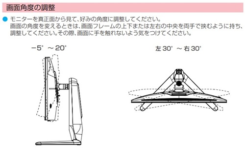 モニターの角度を前後に-5°~20°、左右に左30°~右30°の範囲で調整することができます。