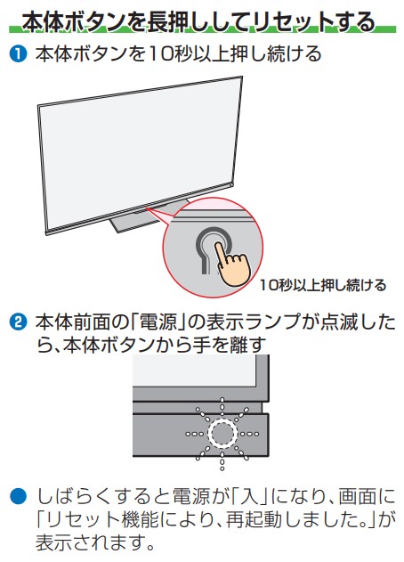 (1)テレビ本体の電源ボタンを10秒以上長押しする。