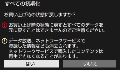 ※設定が初期化され、テレビの電源が切れます。電源が切れたら電源を入れてください。