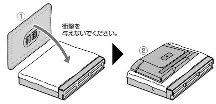 ①必ず本体の背面側を上向きにして簡易テーブルの上にのせてください。