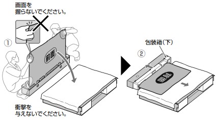 ●組み立ては、包装材をセットした簡易テーブル、またはテレビ本体より大きなテーブルに毛布等の柔らかい布を敷いた作業台で行ってください。