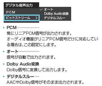[設定]ボタンを押して【音声設定】→【音声出力詳細設定】→【デジタル音声出力】の順に進み「PCM」を選択します。 音声には「PCM」、「AAC」、「Dolby Audio」など様々な種類があります。 サウンドシステム側が対応する音声形式がわからないときは「PCM」を選択し、音が出るかご確認ください。
