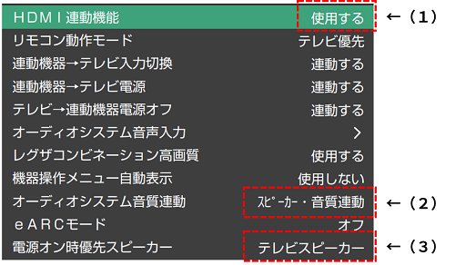 (1)【HDMI連動機能】を選び、設定が【使用する】になっていることをご確認ください。