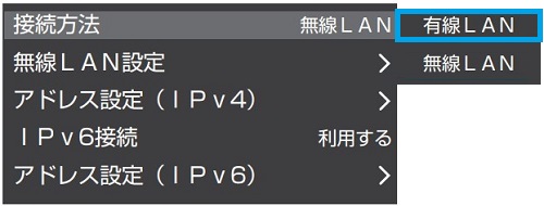 下記の操作を確認し、接続方法が【有線LAN】になっているかご確認ください。