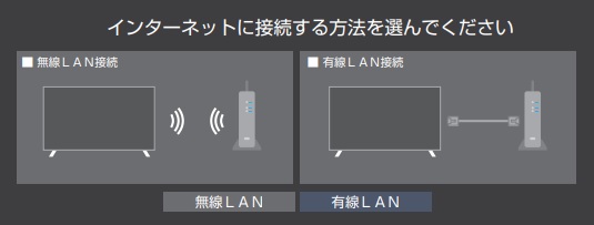 [設定]ボタンを押して、【ネットワーク・サービス設定】→【ネットワーク接続設定】→【かんたんネットワーク設定】→【有線LAN】の順に進みます。